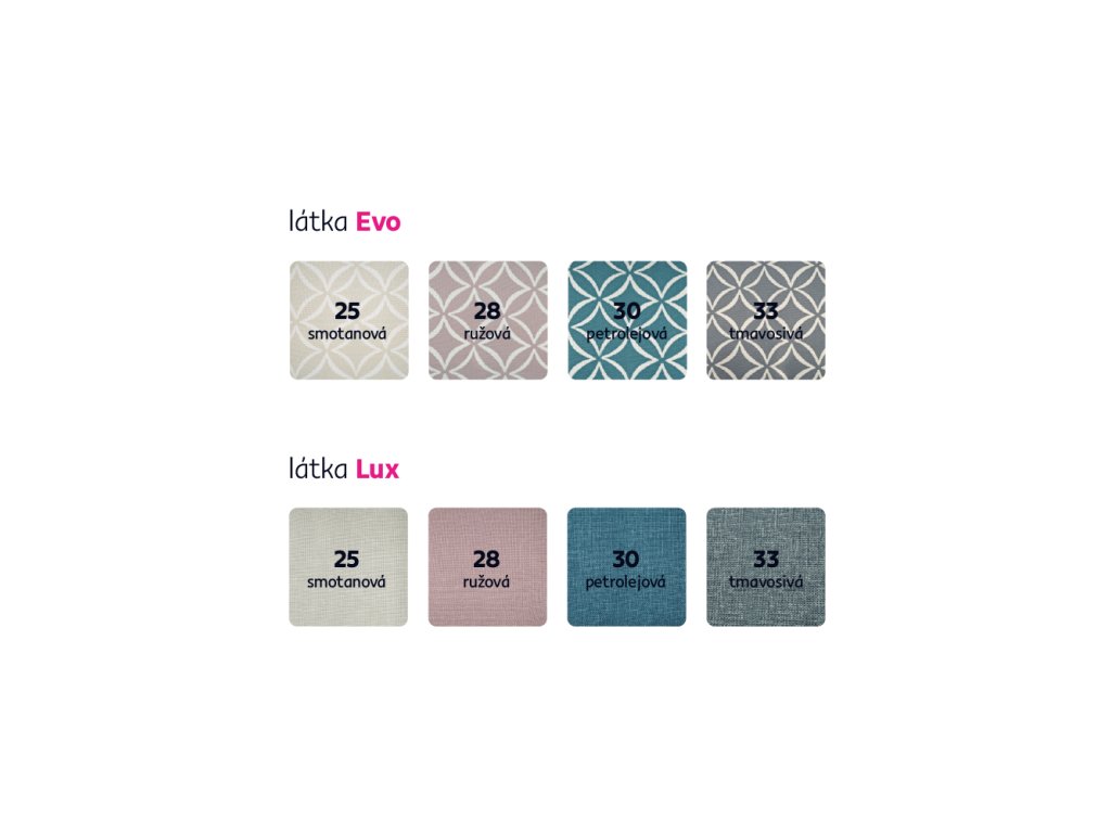 Vyberajte zo 4 farieb látky LUX a 4 farebných vzorov látky EVO podľa vzorkovníka. Jednofarebné kreslo alebo kreslo v kombinácii farieb a vzorov vám dodáme v dodacej lehote 8-10 týždňov. Taktiež si môžete vybrať z dvoch farebných prevedení nožičiek: drevo v prírodnom odtieni buk alebo drevo s čiernou povrchovou úpravou. Pri individuálnej objednávke je potrebné zaplatiť 20% zálohu z danej sumy. Po uhradení zálohy bude Vaša požiadavka zadaná do výroby.