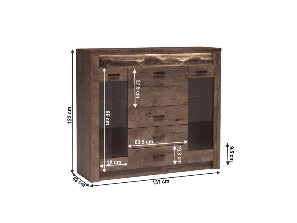 Komoda s vitrínami Inifinity 08Korpus hrubý až 48 mm, hrúbka materiálu zvyšné časti: 16 mm, úchytky kovové