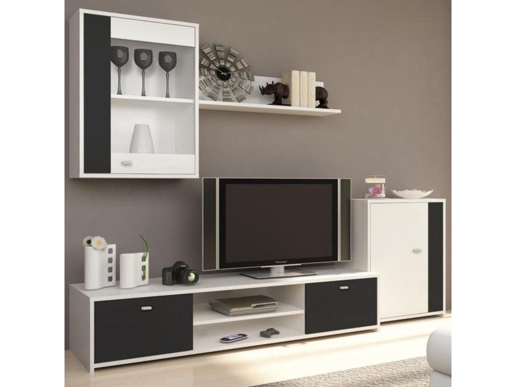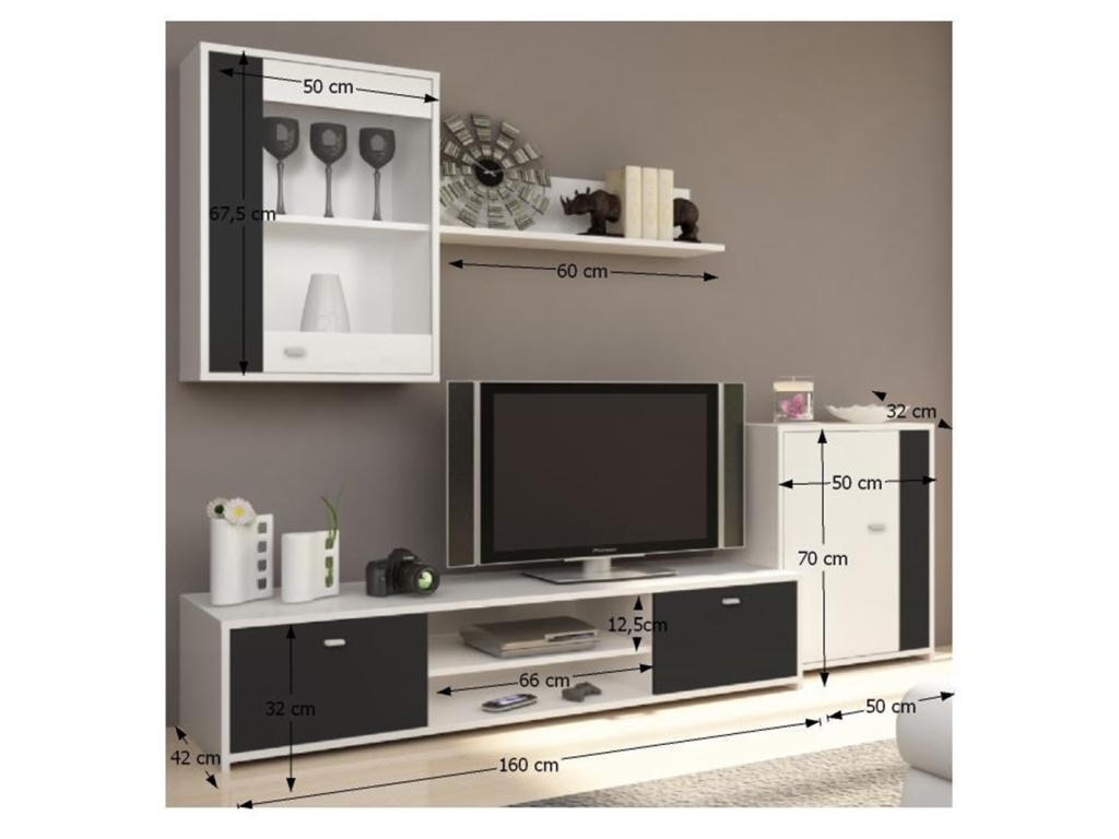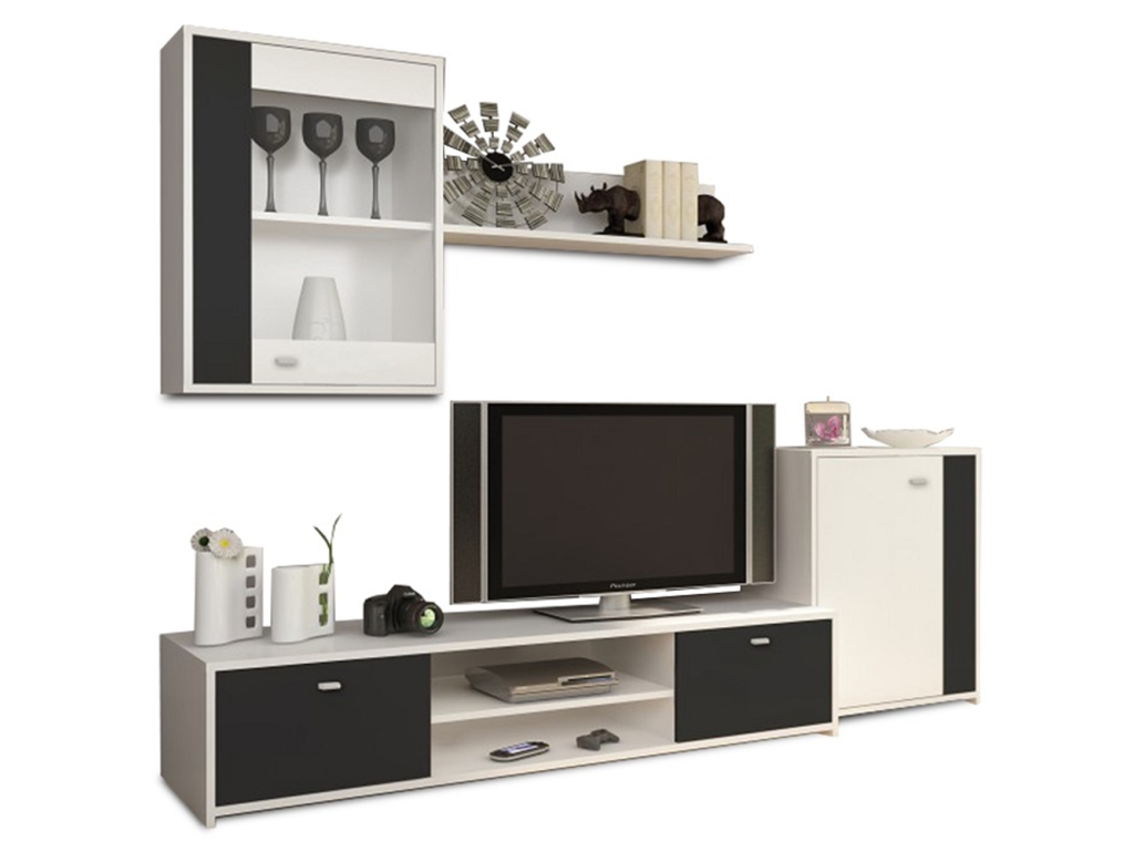 Obývacia izba GENTA vo farebnom prevedení biela/čierna. Materiál laminovaná DTD a ABS hrany.Rozmery celej obývacej steny (ŠxHxV): 210x42x180 cm