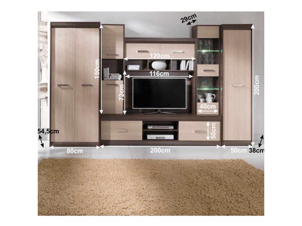 Rozmery obývacej steny (ŠxHxV): 330x40-54x200 cm