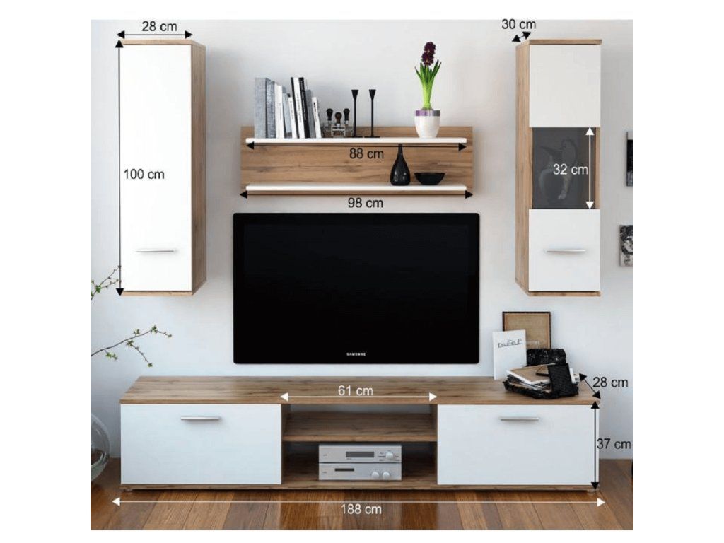 Obývacia stena WAW NEW. RTV stolík, dvojpolica, dve závesné skrinky. Materiál laminovaná DTD. Farebné prevedenie dub wotan/bielaRozmery (ŠxHxV): 188x30x165