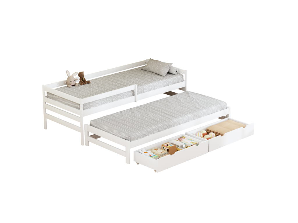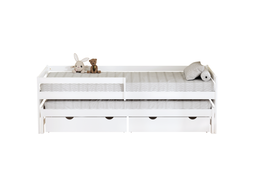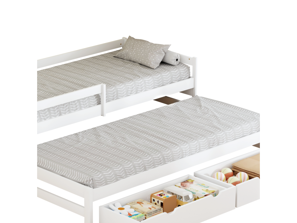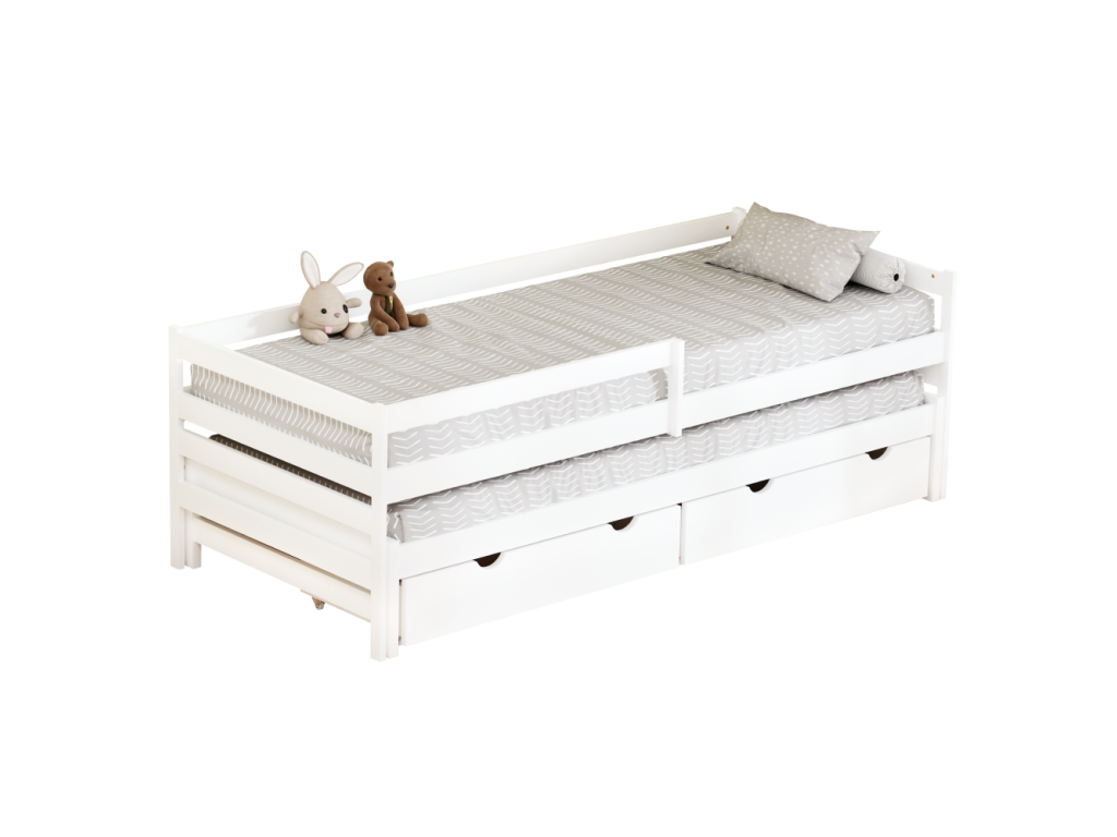 Posteľ s prístelkou a úložným priestorom, 90x200, biela, ELARA