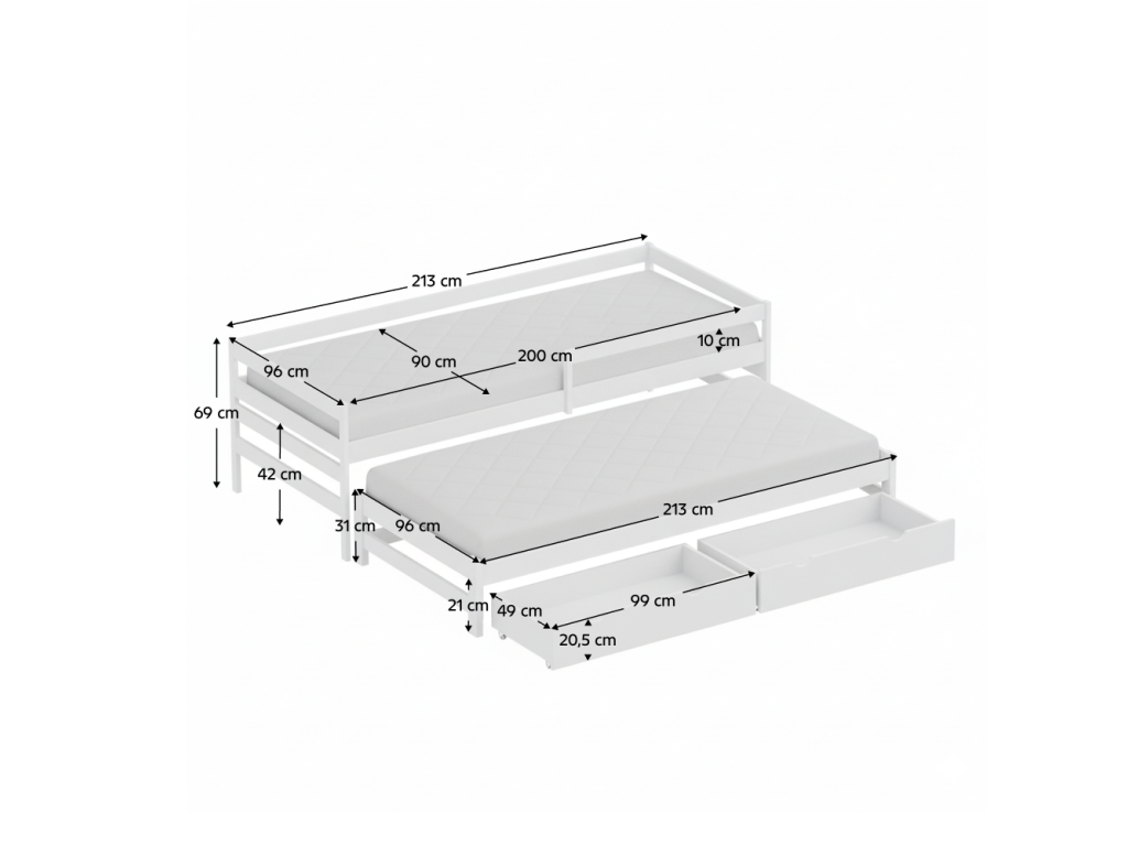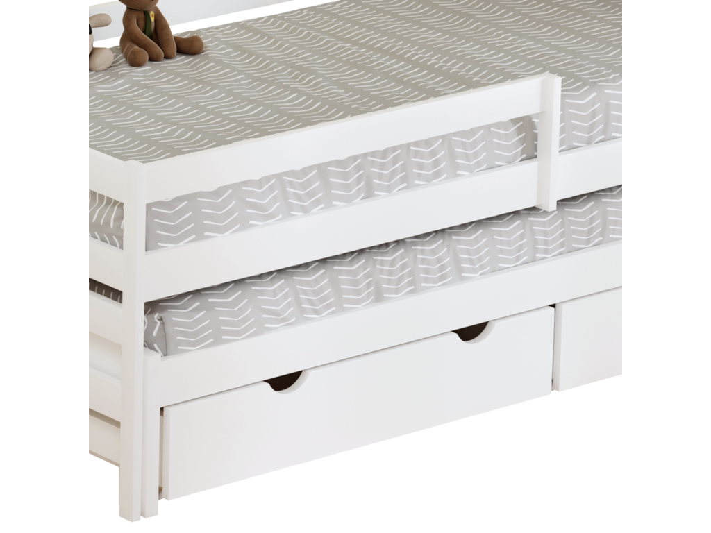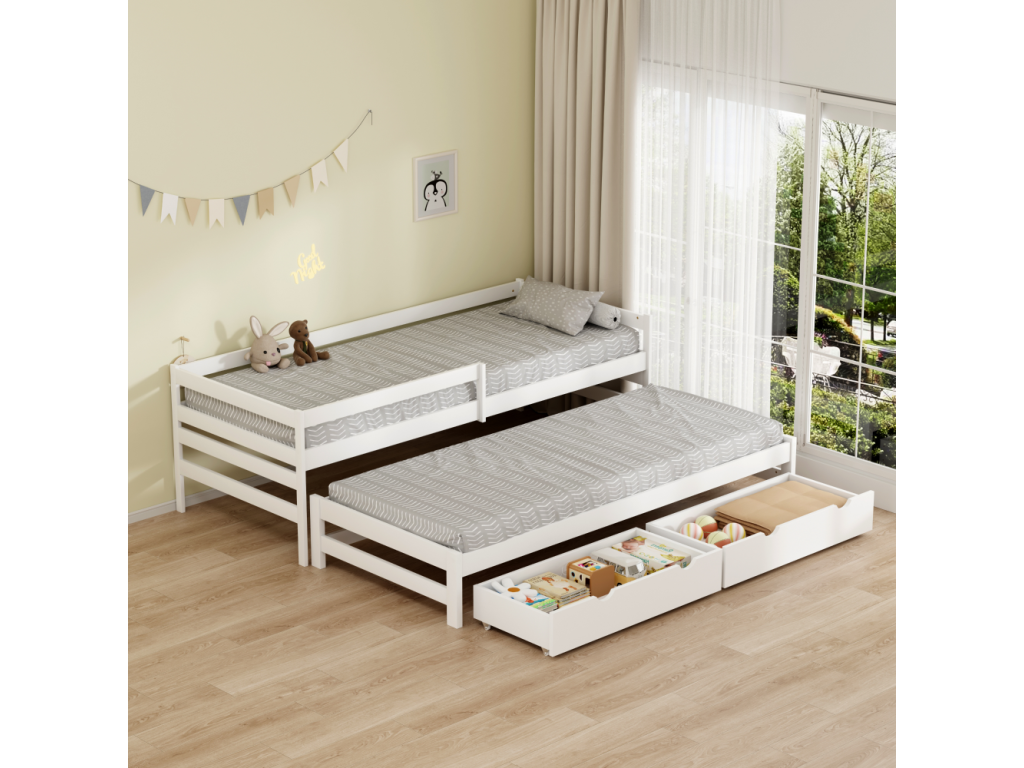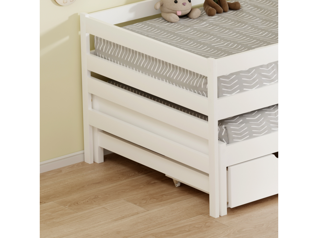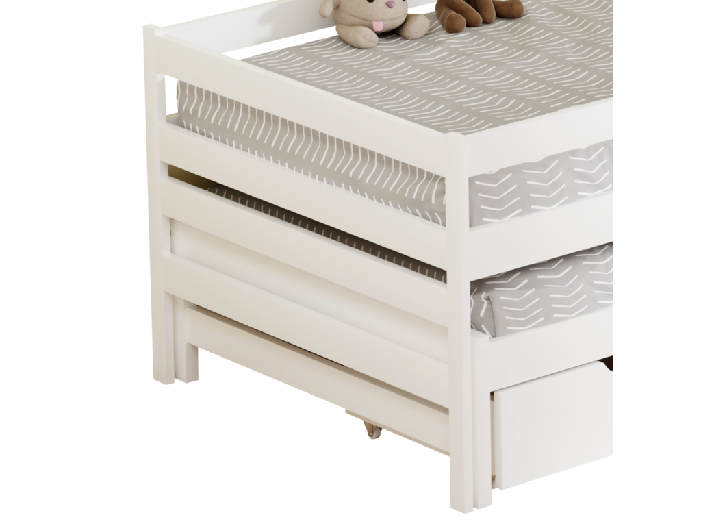 Posteľ s prístelkou a úložným priestorom, 90x200, biela, ELARA