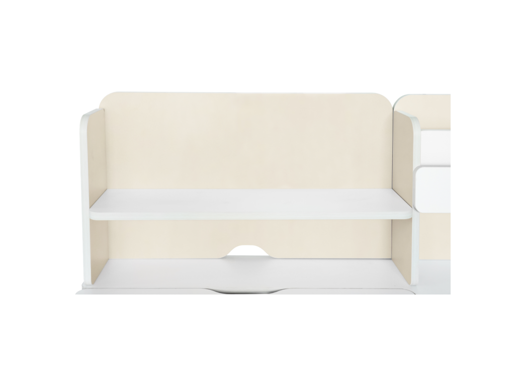Zadný panel obsahuje police, držiak na knihy a otvor na vedenie káblov