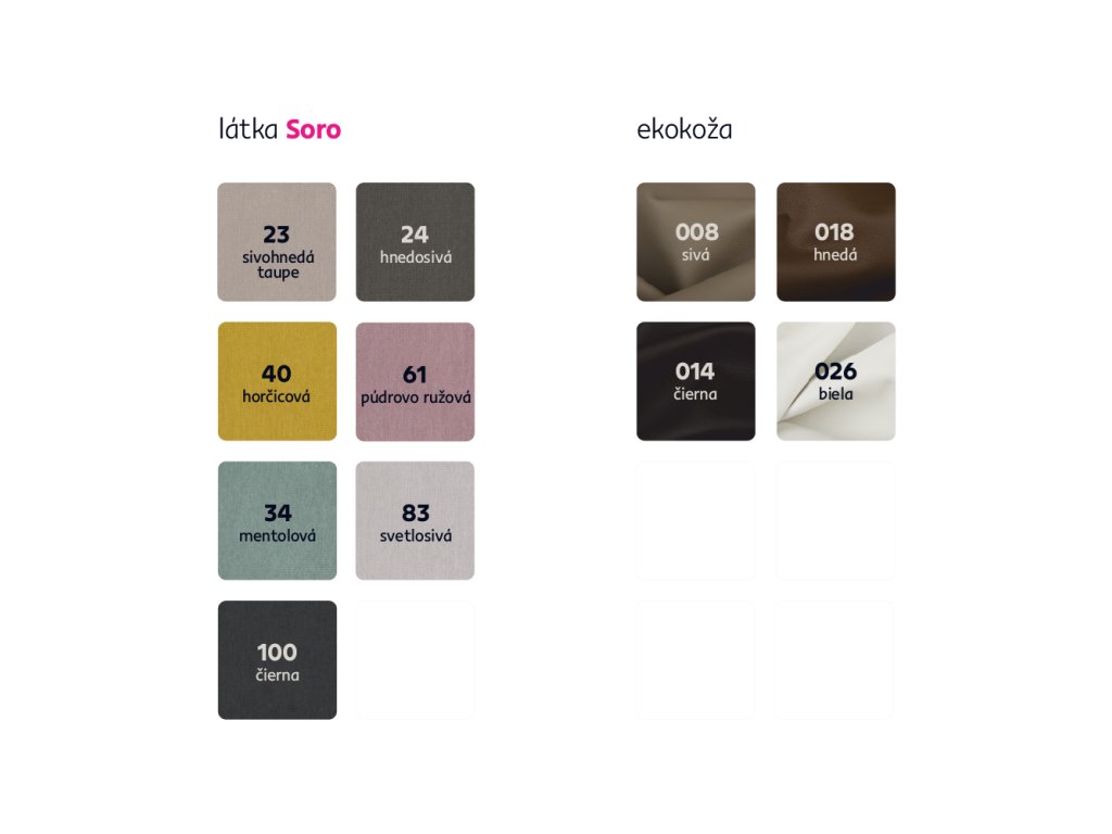 Možnosť objednania v 4 farebných prevedeniach ekokože a v 7 farebných prevedeniach látky Soro v cene 1.159 eur. Svoj výber poznačte do poznámky v objednávke. Pri individuálnej objednávke je potrebné zaplatiť 20% zálohu z danej sumy. Po uhradení zálohy bude Vaša požiadavka zadaná do výroby. Dodacia lehota 6-8 týždňov.