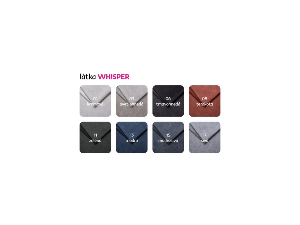 Materiál čalúnenie: Whisper 04Oderuodolnosť látky podľa testu Martindale: 100 000