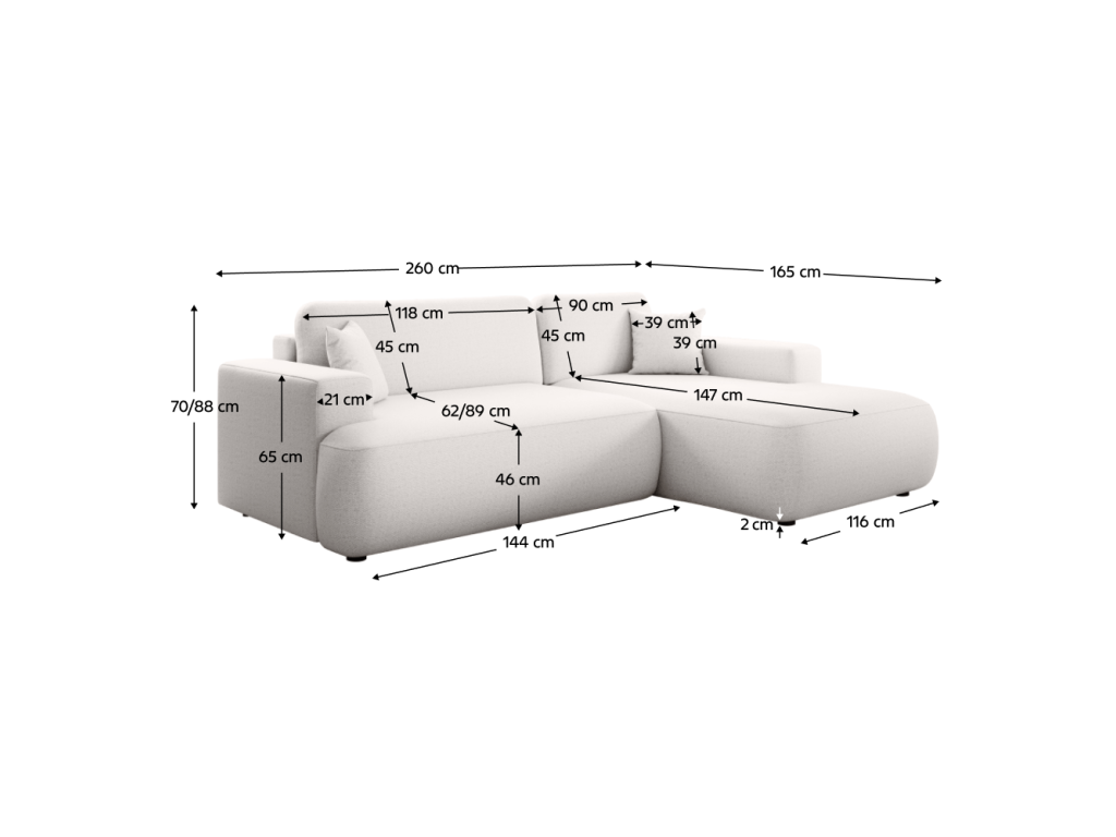 Rozmery (ŠxHxV): 260x165x70/88 cm