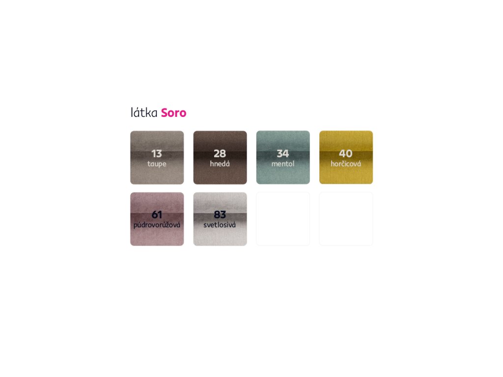Možnosť objednania v 6 farebných odtieňoch látky Soro v cene 1.369 eur. Dostupné v kombinácii látka + ekokoža alebo celá v látke. Pri individuálnej objednávke je potrebné zaplatiť 20% zálohu z danej sumy. Po uhradení zálohy bude Vaša požiadavka zadaná do výroby. Dodacia lehota 6-8 týždňov.