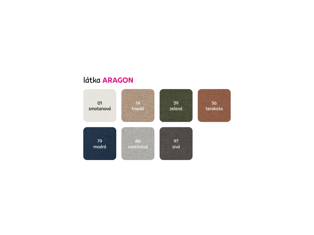 Ponúkame vám možnosť vybrať si zo 7 farebných prevedení látky Aragon za cenu 779 Eur. Pri individuálnej objednávke je potrebné zaplatiť 20% zálohu z danej sumy. Po uhradení zálohy bude Vaša požiadavka zadaná do výroby. Dodacia lehota 6-8 týždňov.