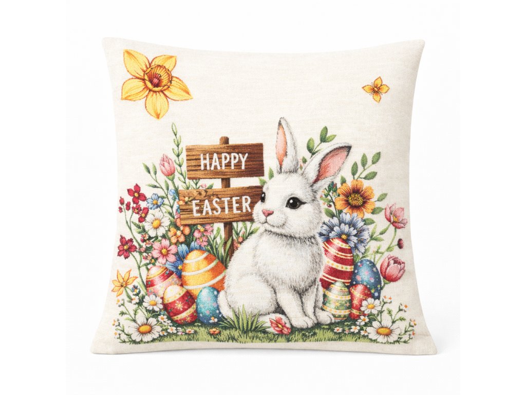 Oživte svoj domov jemnou jarnou atmosférou s dekoratívnou veľkonočnou obliečkou na vankúš v elegantnom gobelínovom prevedení. Veselé veľkonočné motívy ako zajačiky, ovečky, kvety či farebné kraslice vnesú do interiéru sviežosť a pravú sviatočnú náladu. 🐥🌷