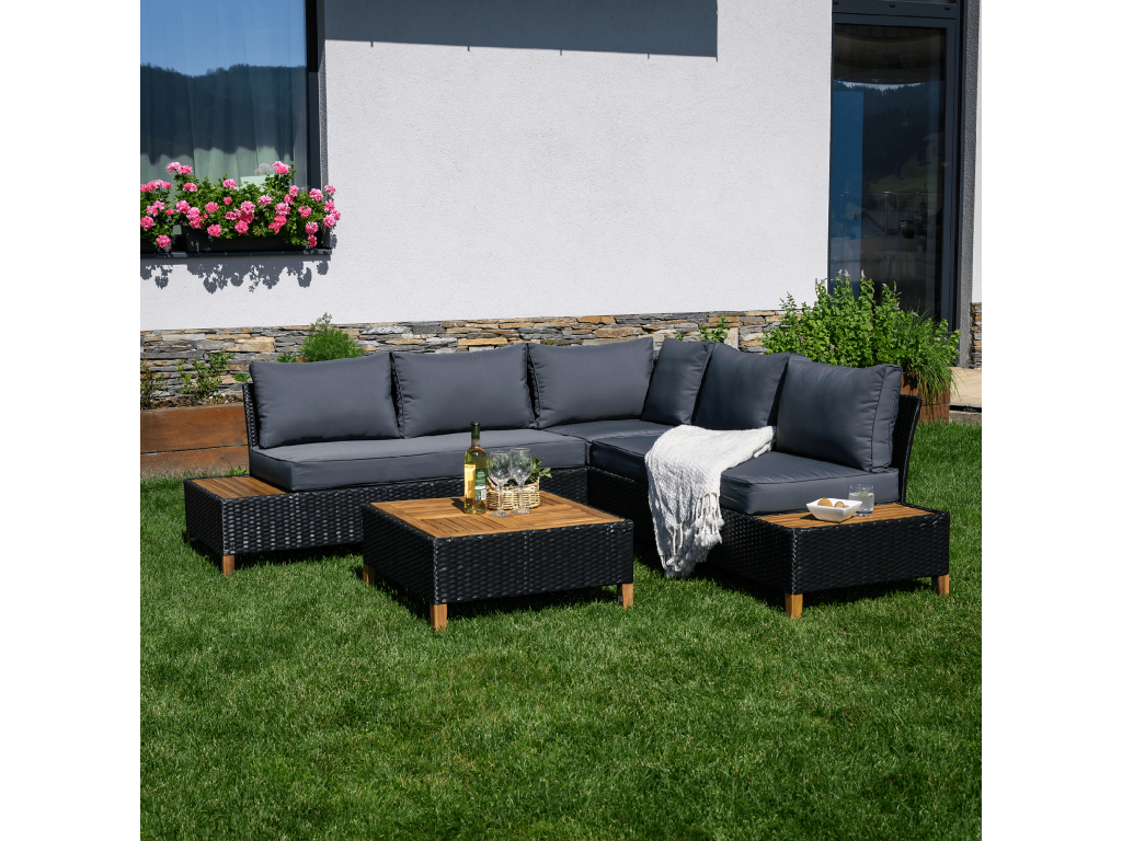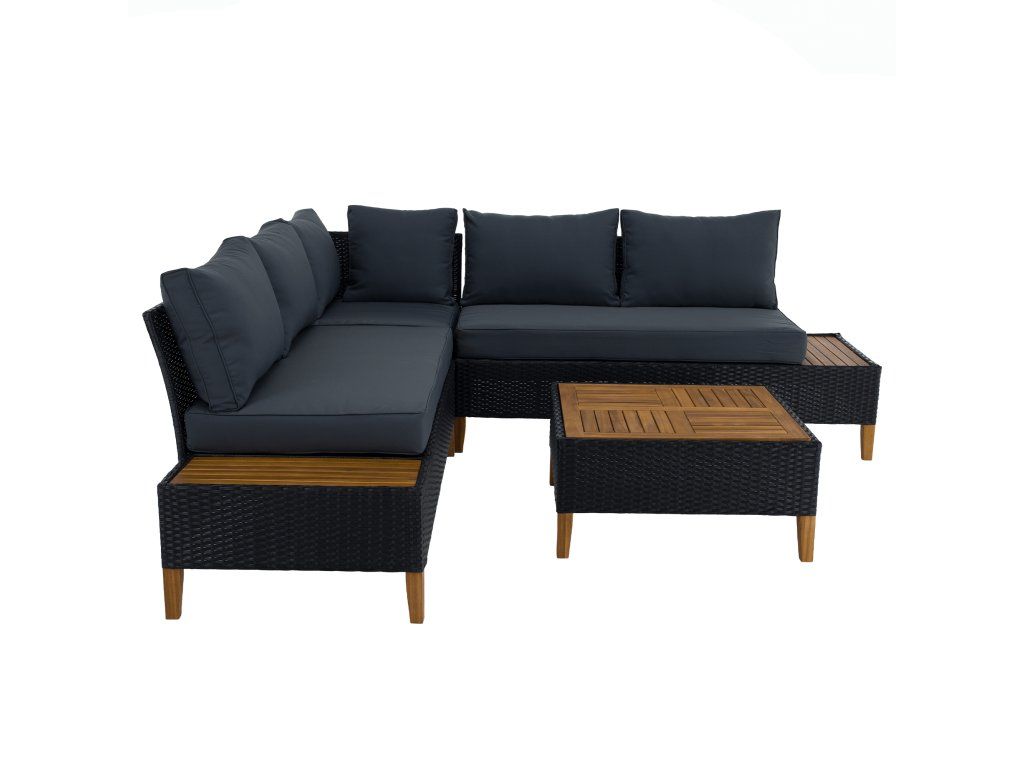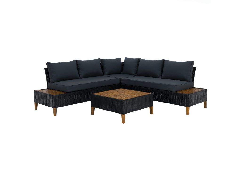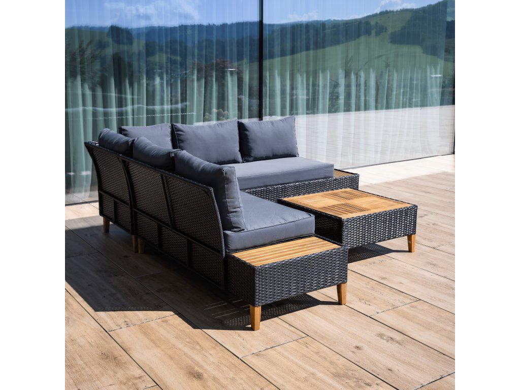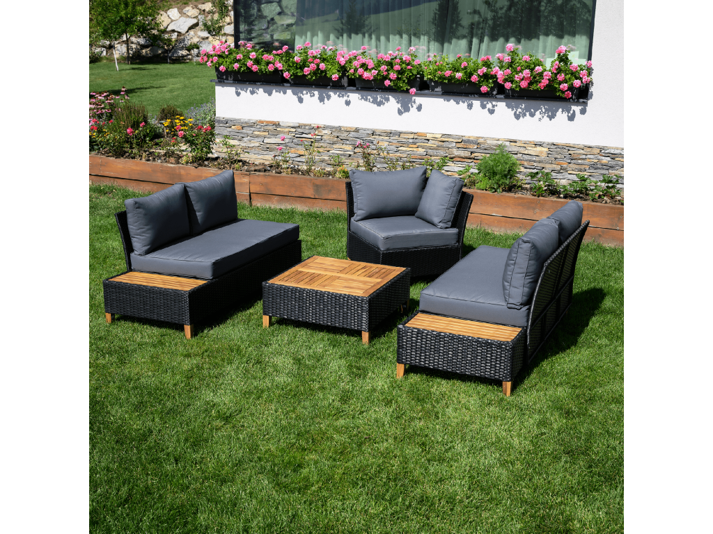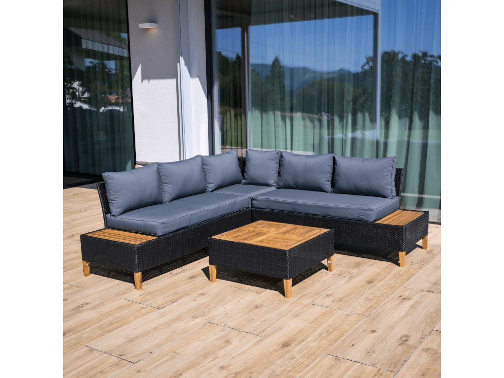 Záhradný ratanový set, akáciové drevo, čierna/sivá/prírodná, MALKOM